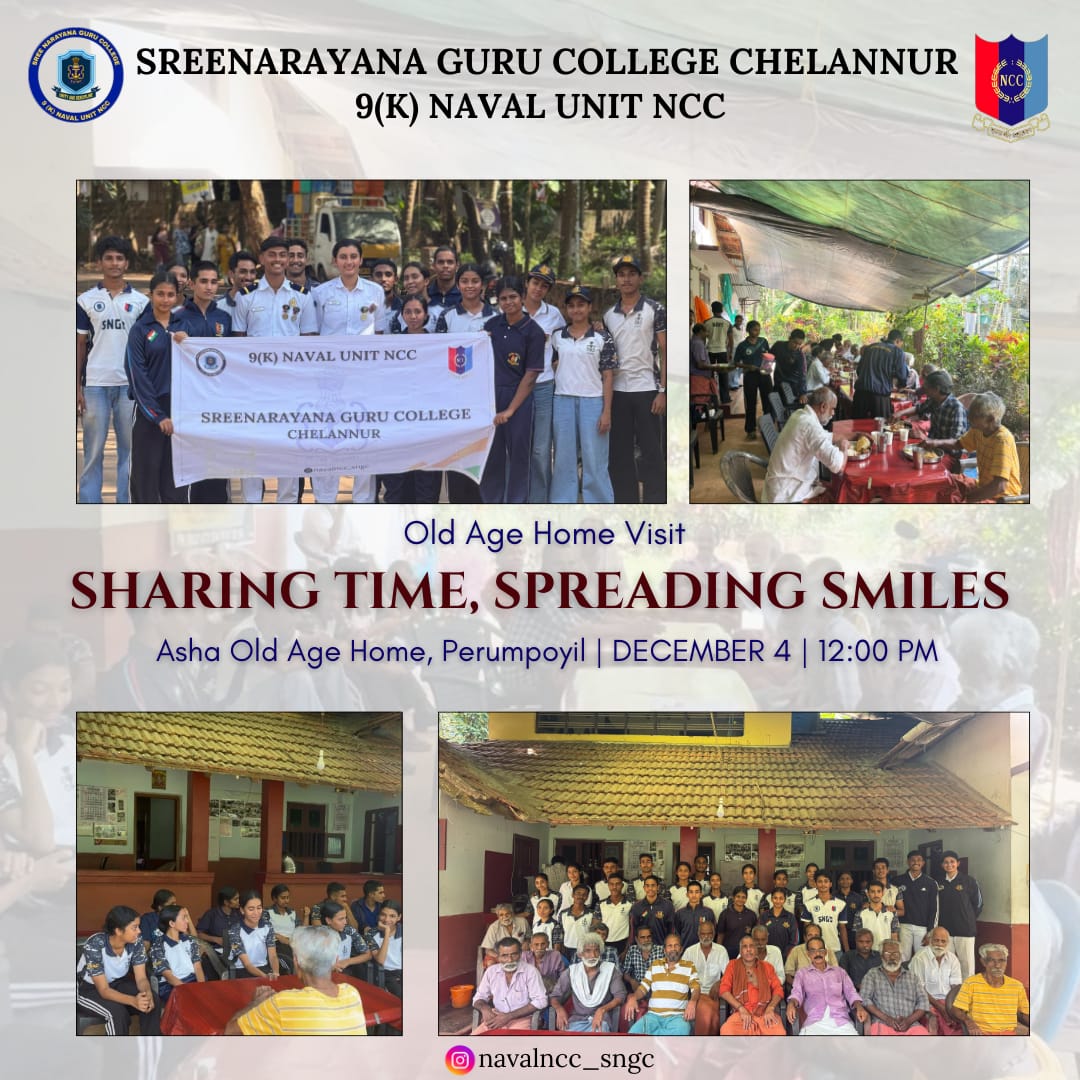 The Naval NCC Unit of Sree Narayana Guru College, Chelannur, organized a Community Outreach Programme as a part of Navy day on 4th December 2025 by visiting a nearby Old Age Home 'Asha'. Under the guidance of Care Taker Officer (Dr. Vineesh K. P.) and with the heartfelt motivation from Principal Prof. (Dr. Kumar S. P.), the cadets actively engaged in interacting with the residents,performing small cultural activities,offering support, and spending quality time with them.