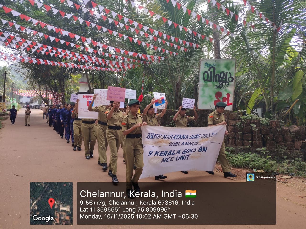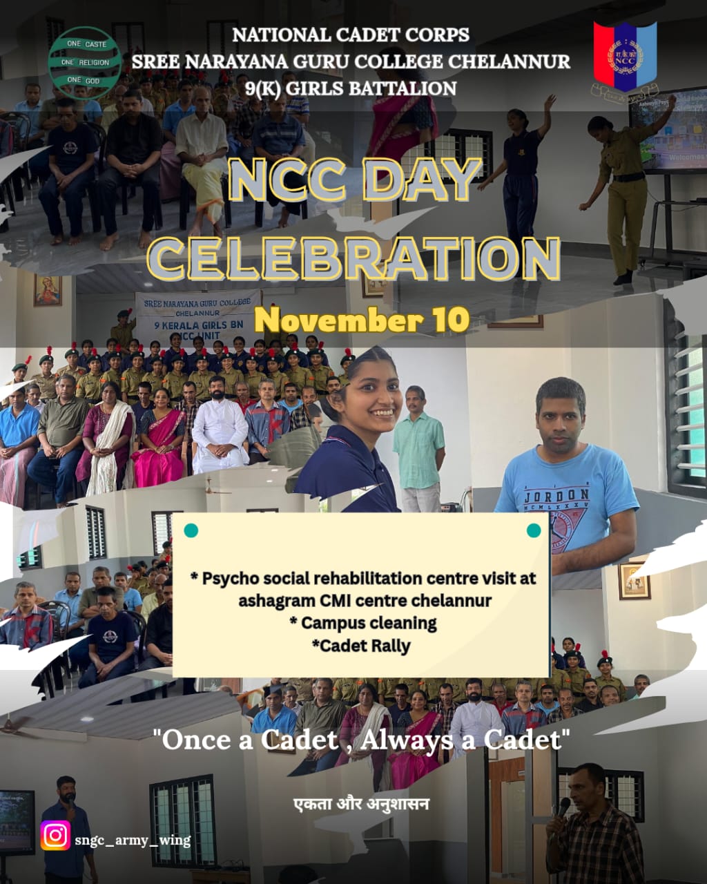 SNG COLLEGE, CHELANNUR 9K Girls Bn. NCC 10/11/2025 Monday NCC Day is celebrated on the fourth Sunday of November. The National Cadet Corps (NCC) was formed on July 15, 1948, but the day is observed in November to commemorate the first units being raised in Delhi on that day in 1947. As a part of celebrating NCC Day, Army Wing cadets of Sree Narayana Guru College, Chelannur conducted campus cleaning, cadet rally and a special program at Ashagram CMI Center, Chelannur. The programme began with the cadets cleaning the college campus, followed by cadet rally to Ashagram. The programme started with a warm welcome to the residents of Ashagram. The cadets organized various activities to entertain and engage the residents. The programme started with cultural activities like singing and dancing. Both the cadets and the inmates performed, which made the residents happy. Later, cadets and ANO Capt. Dr. Sindhu Krishnadas interacted with the residents, distributed sweets and listened to their stories and experiences. The cadets also visited the paper-bag-making section. The event concluded with a speech of Father Jose Prakash CJ (The director of the rehabilitation center). Overall, the NCC Day programme was conducted effectively with active participation of the cadets.